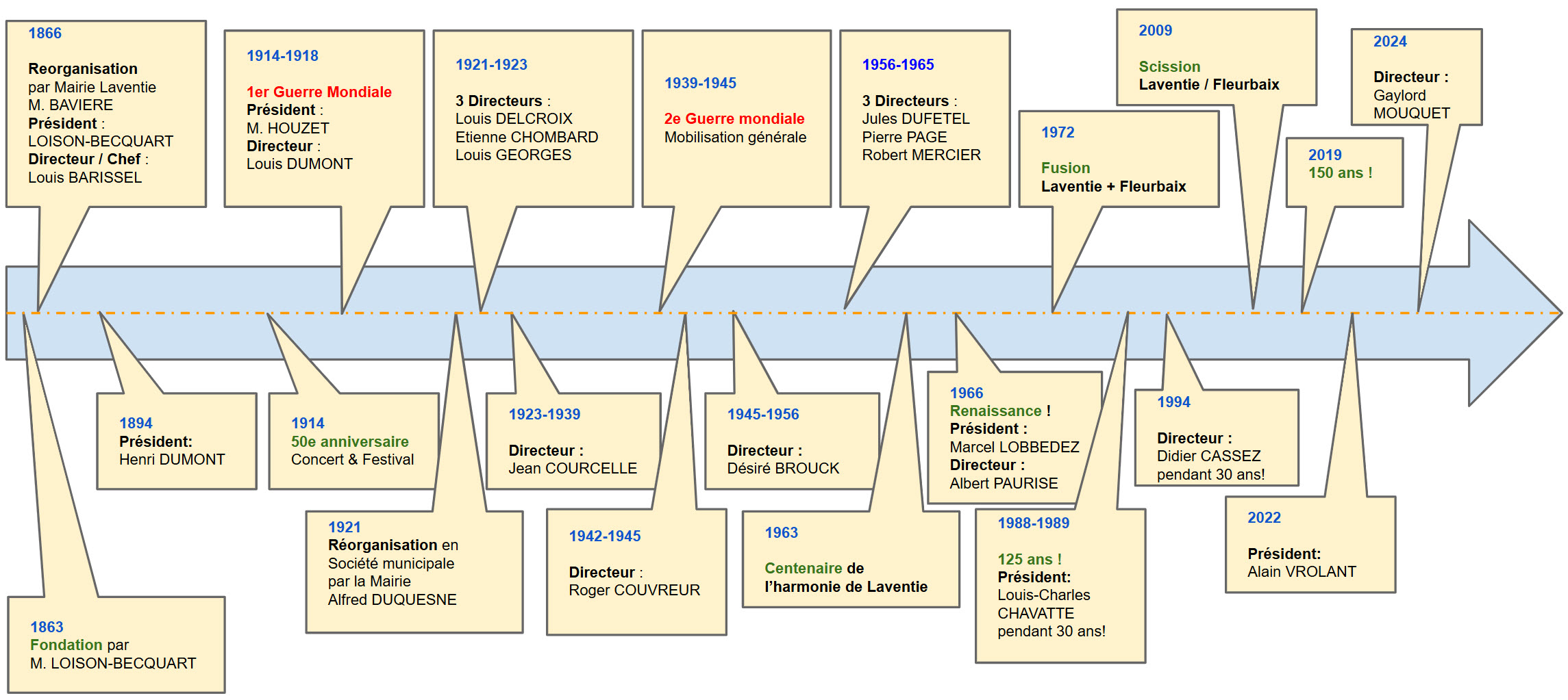 La société de Musique de LAVENTIE a été fondée en 1863 par Monsieur LOISON - BECQUART et réorganisée en 1866 sous les auspices de Monsieur BAVIERE, Conseiller d'Arrondissement et Maire de LAVENTIE, avec pour directeur Monsieur Louis BARISSEL.